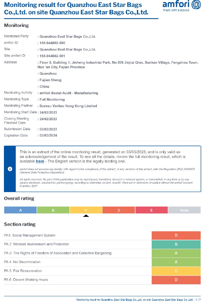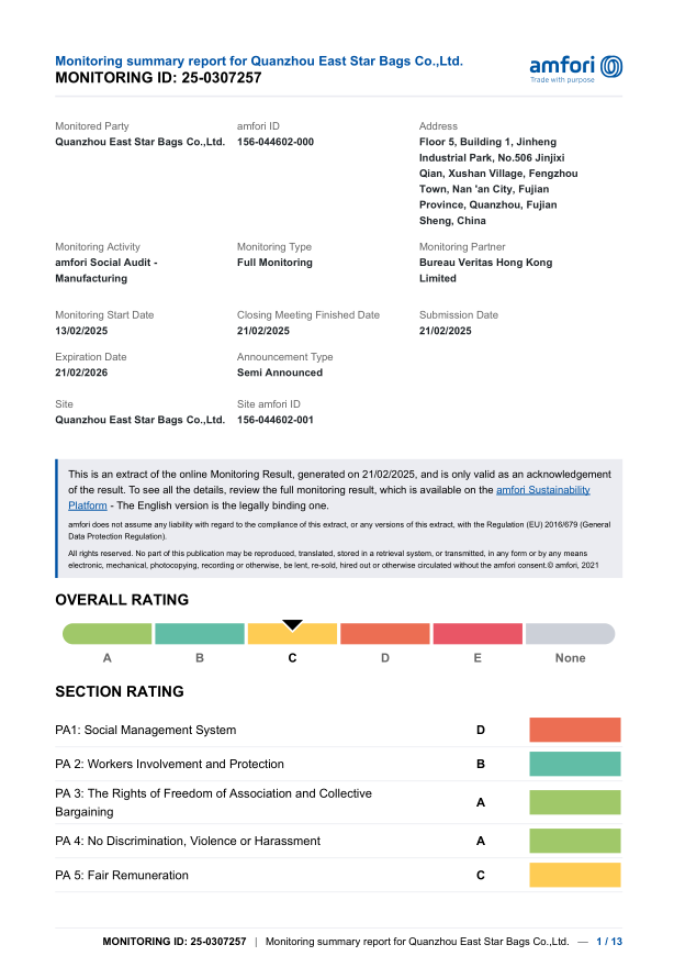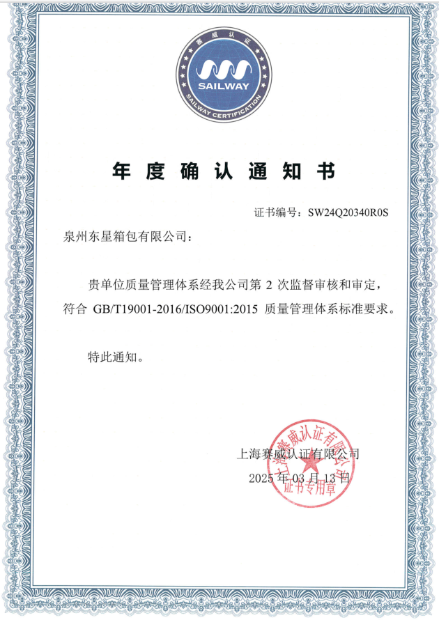 The founder East Chen was engaged in bag in 1999. From the R&D to the QC, from the apprentice to the grassroots staff, and then to the senior executive. Owing to years of experience in bag field he is very familiar with the whole bag production process, quality control, factory management, etc. With rich experience, he founded Quanzhou East Star bags Co., Ltd. in 2010, focusing on R&D and production. The company is also committed to continuous improvement of internal management and sustainable development. It has successfully gained IS09001 certification, BSCI, Sedex, anti-terrorism audit and so on.